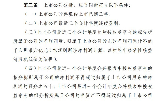 凭证《分拆功令》,上市公司分拆,应当同期合乎4个条目。其一即是上市公司最近三个司帐年度相接盈利。